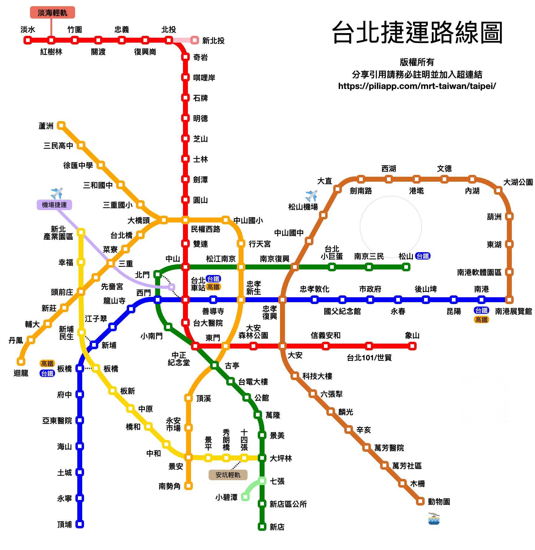 台北捷有藍、橘、紅、咖、綠縣橫跨台北市及新北市。